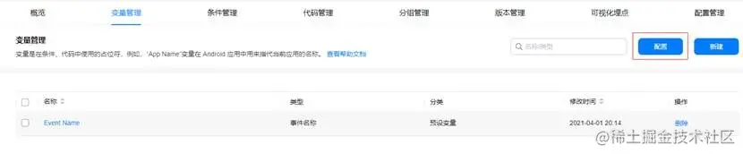 在变量管理中点击“配置”,选择Event Name,点击“确定”即可添加成功。