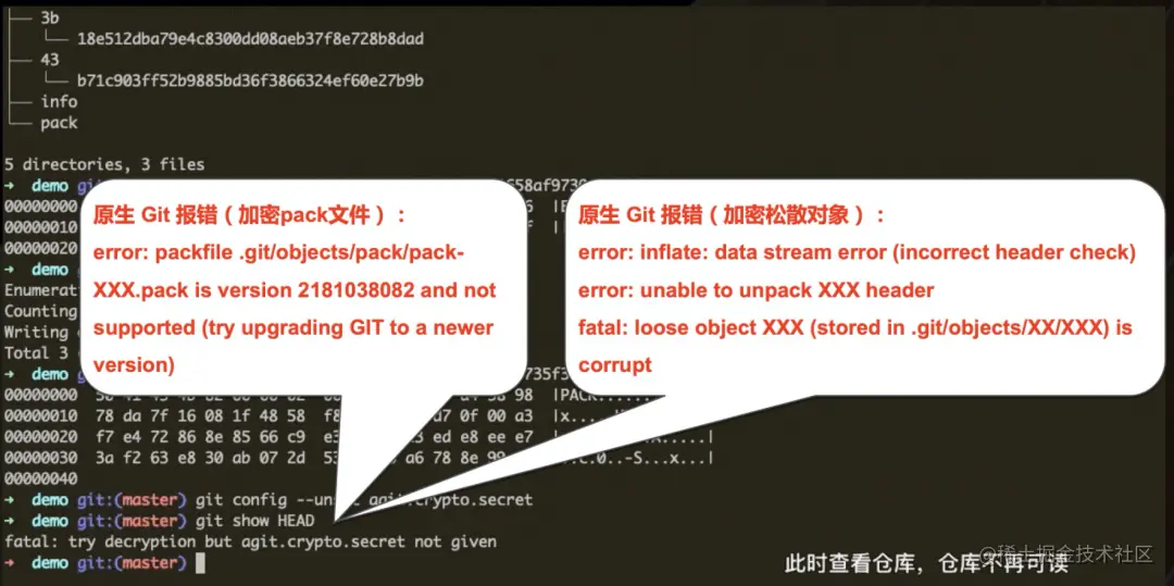 针对加密的打包文件packfile,会提示当前版本较低,请升级Git版本;若针对松散对象,则提示文件头不正确,因为不是一个zlib的压缩头。
