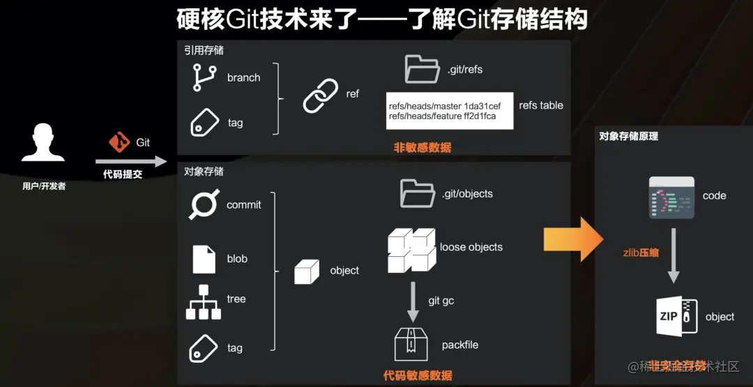 对象是Git中存储数据的基本单元。通常情况下,对象存储在以内容hash值命名的单个文件中,我们称之为松散对象。而通过执行gc(也就是垃圾回收)之后,这些对象就会被打包到一起,生成一个打包文件packfile。代码内容及文件名,都存储在blob及tree对象当中,所以可以认为,对象中是包含用户的代码内容数据,也就是包含敏感数据的。