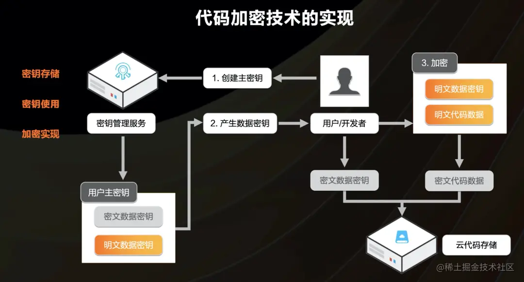 引入代码加密技术,通过使用用户的密钥,加密云端托管的代码数据,既增加了静态存储数据的安全性,又可以阻断代码对运维人员的可见性,从而消除用户上云的顾虑。