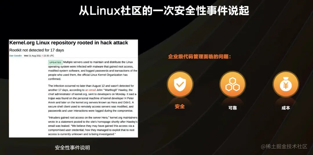 这是为什么呢?因为他们使用了Git进行代码维护,对于linux内核代码将近40000个文件来说,每个文件都做了hash来确保唯一性,因此很难在不引起注意情况下,更改旧的版本。