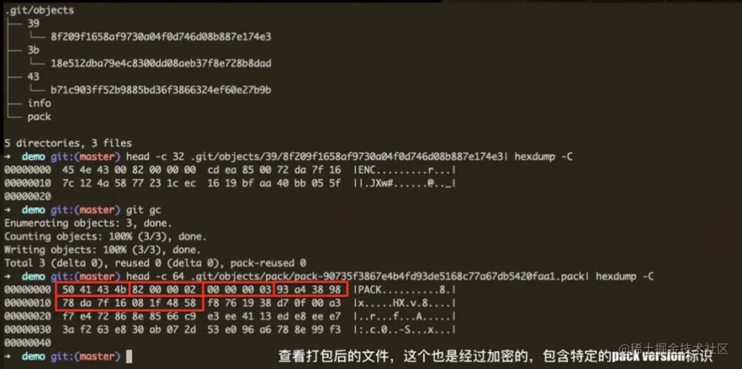 在完成松散对象加密之后,我们可以通过git gc ,将松散对象转换为打包对象,再看一下打包对象会发生什么样的变化呢?由图中我们可以发现,加密后的打包文件包头版本中,不再是原有的00 00 00 02,而是增加了特定标识的82 00 00 02,并且包头也由原有的12字节扩展为24字节,增加了12字节的NONCE用于增加安全性。
