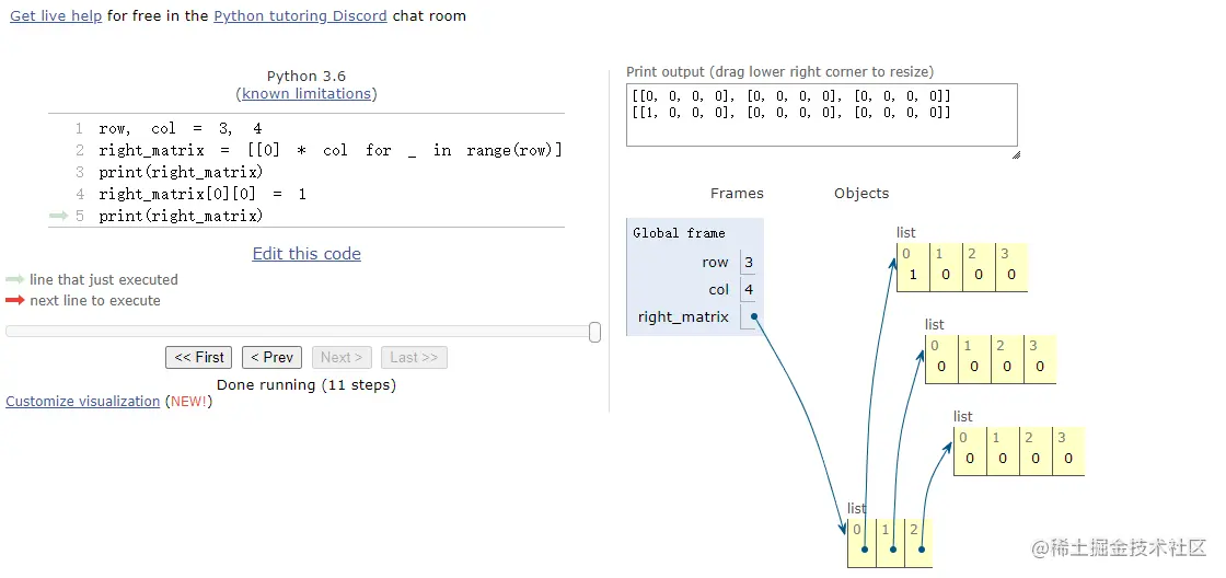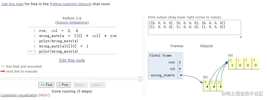 使用pythontutor.com/visualize.h… 网站执行上面的right_matrix和wrong_matrix代码来对比实际的内存情况,来验证一下