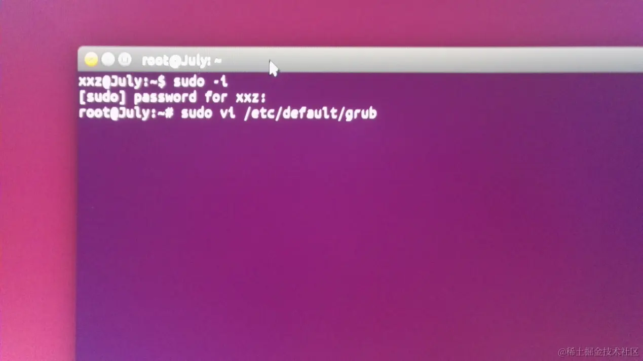 输入sudo vi /etc/default/grub此时系统会进入一个文本页面。在第20行前后会出现GRUB_CMDLINE_LINUX_DEFAULT="quiet"。将光标移动到这个命令最前端,然后键盘点击Esc键,再点击y键两次,点一下p键。就会将本条指令复制一个放到下一行。然后点击i键,就能进行编辑了,在本行命令前面删除#号,然后移动到复制出来的那条,命令前面添加#号,按Esc键。Shift+:输入wq。