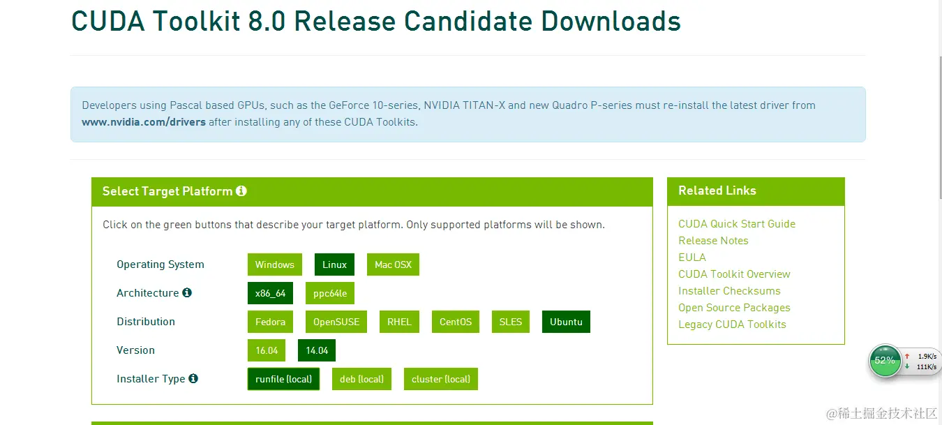(1)在NVIDIA的CUDA下载页面下,选择要使用的CUDA版本进行下载。