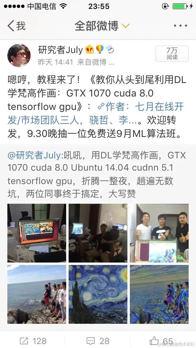 - 22号早上8点,用DL学梵高作画,GTX 1070 cuda 8.0 Ubuntu 14.04 cudnn 5.1 tensorflow gpu,折腾一整夜,趟遍无数坑,两位同事一PHP一市场终于搞定。(恩,有人说,PHP是世界上最好的语言)。\
