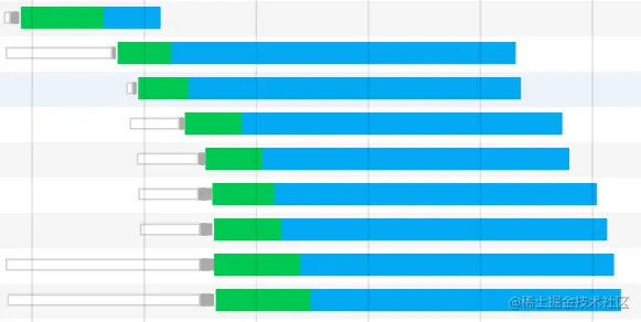 如图所示,绿色部分代表请求发起到服务器响应的一个等待时间,而蓝色部分表示资源的下载时间。按照理论来说,HTTP响应理应当是前一个响应的资源下载完了,下一个响应的资源才能开始下载。而这里却出现了响应资源下载并行的情况。这又是为什么呢?
