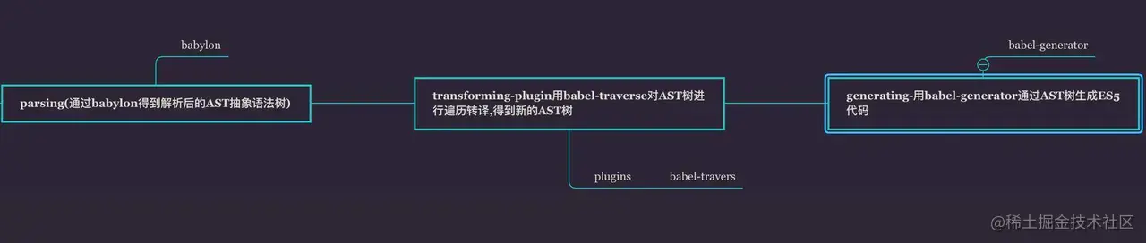 Babel的基本原理就是将源码转换为抽象语法树,然后对抽象语法树进行处理生成新的语法树,最后将新语法树生成新的JS代码。整个编译过程可分为三个阶段: