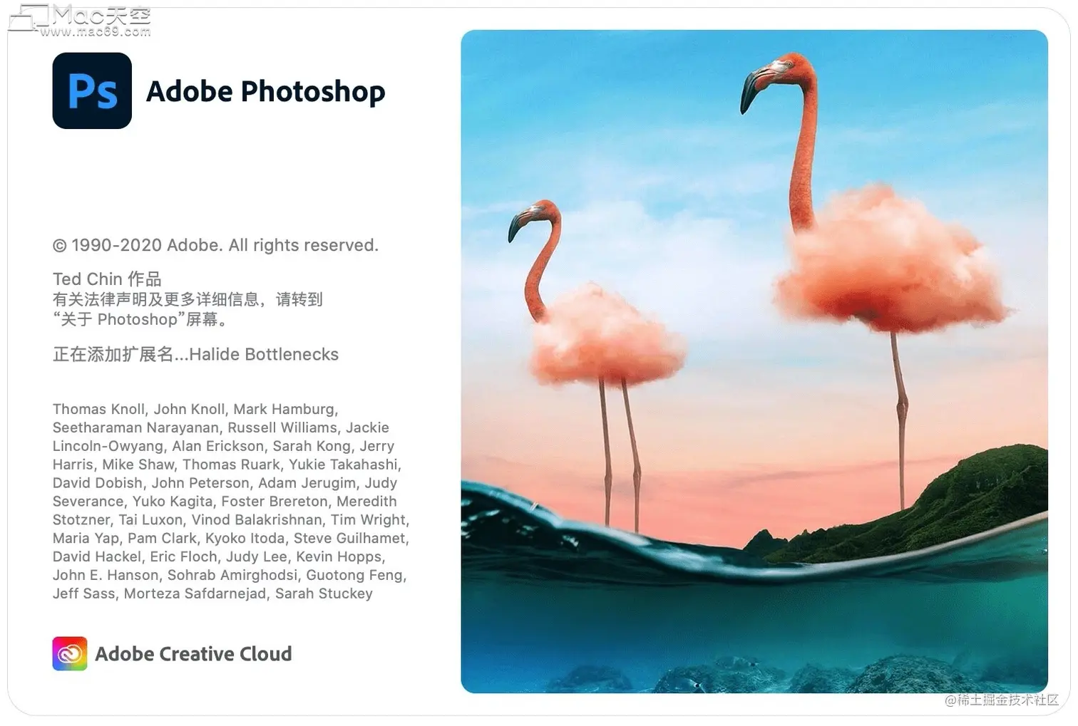 安装后,赶紧启动 PhotoShop 2021 for mac 看看,最新的启动界面是两只火烈鸟。