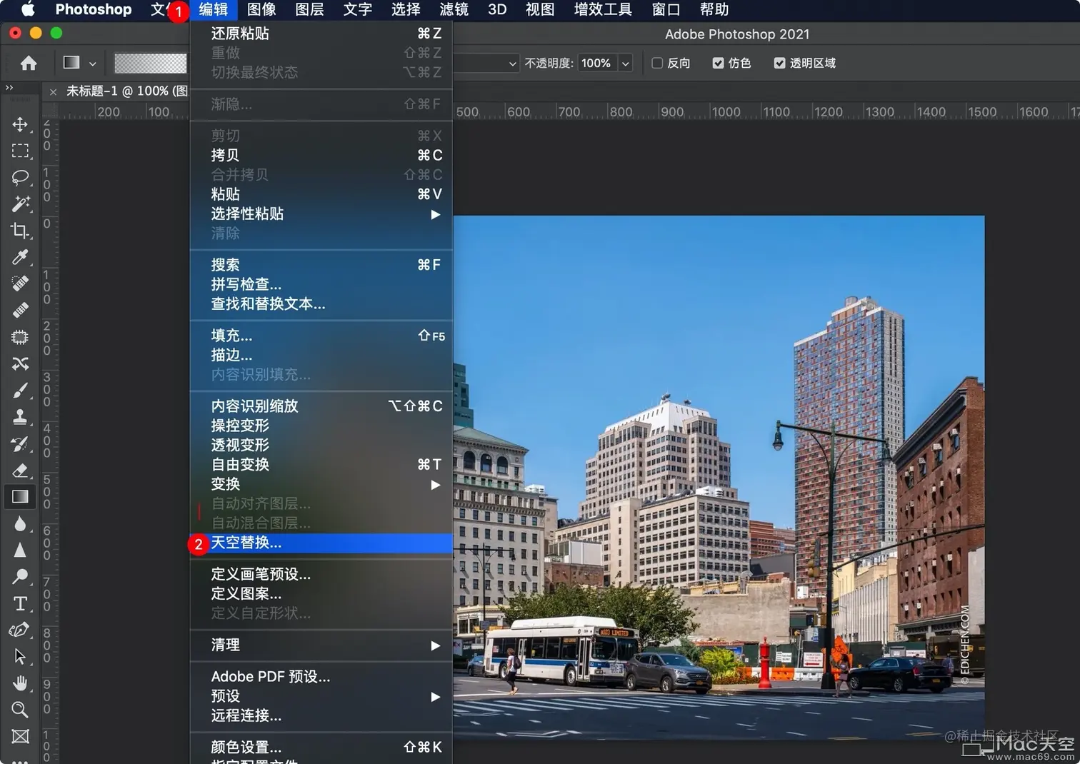 打开照片后,我们在Ps mac版的菜单选择“编辑”->“天空替换”