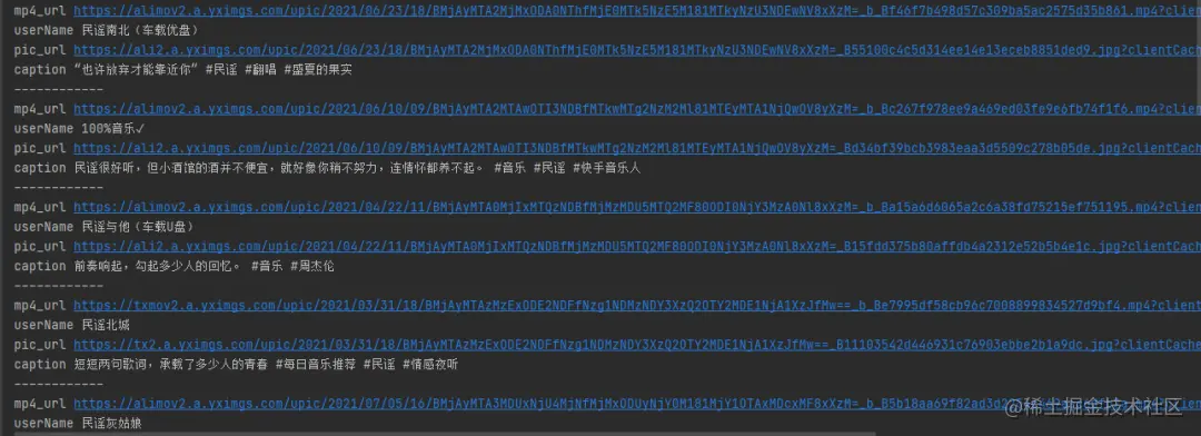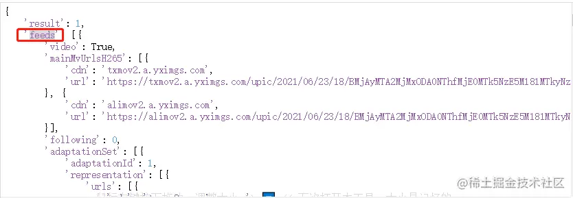 通过查看返回的数据,可以发现所有的视频内容都在字段feeds中