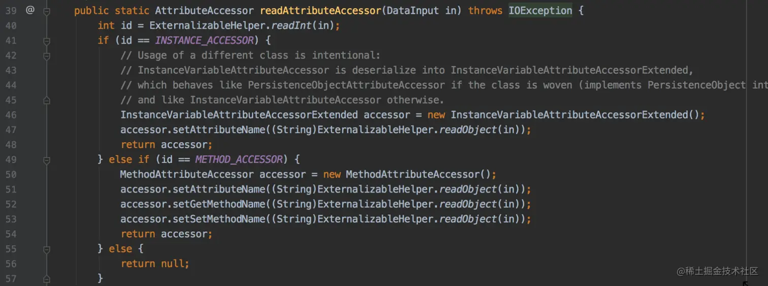 那这里就产生绕过了,虽然LockVersionExtractor和MethodAttributeAccessor类都在黑名单列表里面,但是FilterExtractor类可以替代LockVersionExtractor类,并且在FilterExtractor类的readExternal方法调用了SerializationHelper.readAttributeAccessor,SerializationHelper.readAttributeAccessor方法中又实例化了MethodAttributeAccessor类。