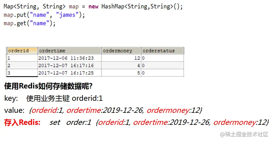 redis得hash和JAVA的hash结构是一样的,我们可以将一些数据库的热点数据写入redis中。例如: