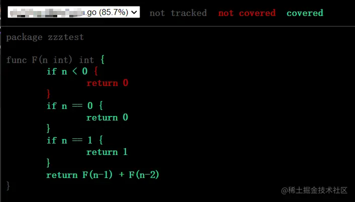 可以看到,测试覆盖率为 85.7% ,说明 F 函数没有被全面地测试,我们再查看详细的单元测试覆盖率报告来看下: