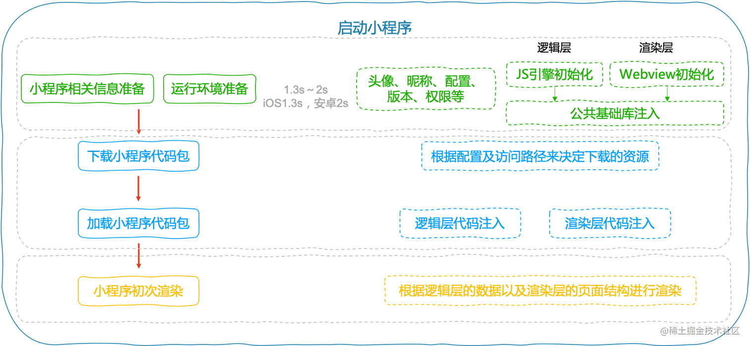根据微信官方文档,微信小程序启动过程包括以下几个部分: