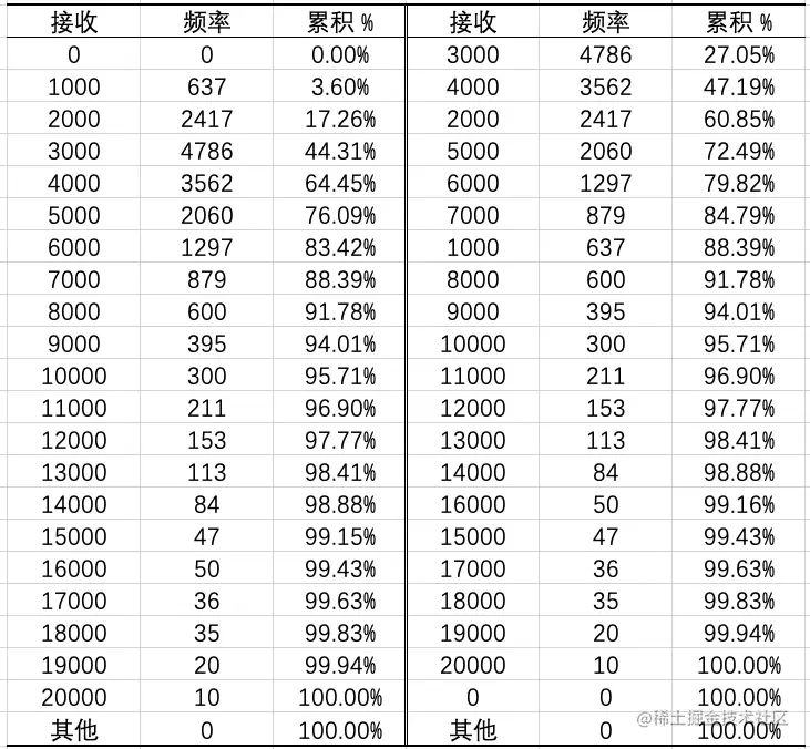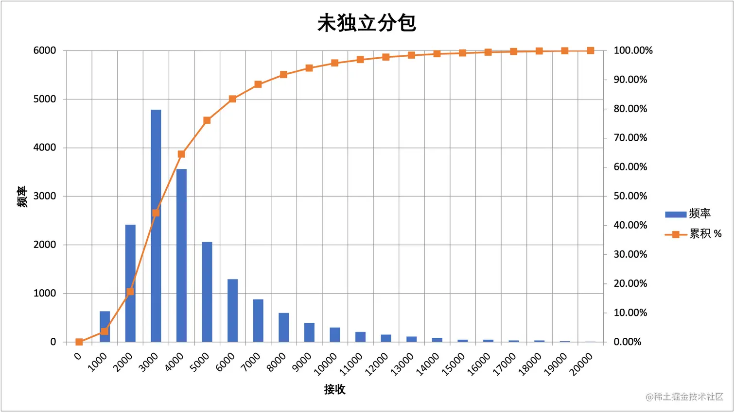 以 1000ms 为间隔,分析启动时长数据在 0-20000ms 的分布,统计数据如下: