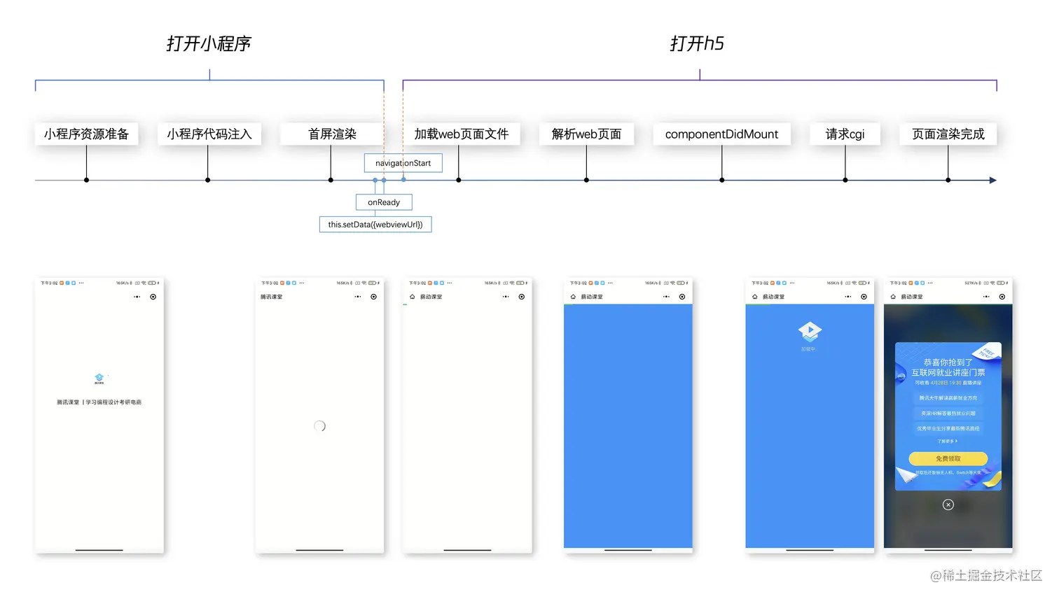 可以看到打开页面的整个过程是串行的,用户需要先从 common-act 页面启动小程序,页面 onLoad 阶段会通过参数生成 h5 链接并通过 setData 传输给视图层的 <webview /> 组件。在页面参数中已包含页面地址(不用从配置平台换取 url)的情况下,整个打开的过程约为 小程序启动时长 + h5 加载时长。