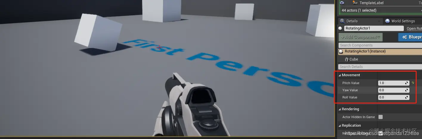 接上一节教程,在本教程中,我们将每帧都对一个 actor 进行旋转。创建一个新的 C++ Actor 类并将其命名为 RotatingActor。在头文件中,我们将创建 3 个 float 变量。我们将把它们的 UPROPERTY 设置为 EditAnywhere,这样我们就可以在编辑器中更改值,我们将把所有变量放在 Movement 类别中,以使它们在一起,并与其他属性分开。