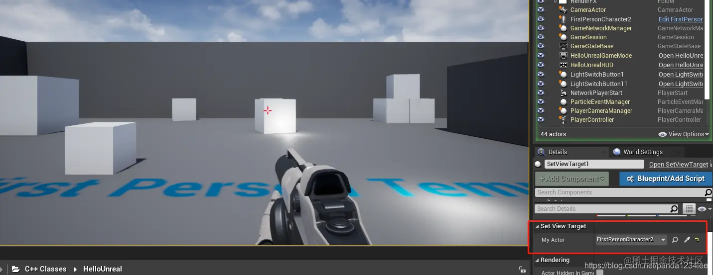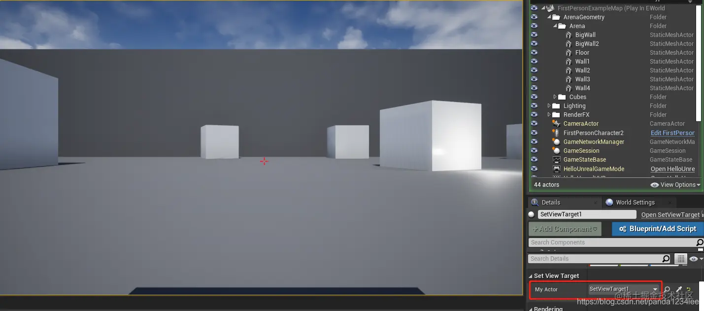 在这个例子中,我们所有的逻辑都放在了 BeginPlay 函数中【不是构造函数中哦,不然 UE4 可能会崩溃】。我们需要通过执行 UGameplayStatics::GetPlayerController(this, 0) 来获取当前玩家。这将获得游戏场景中的第一个玩家。接下来我们将使用 SetViewTarget(MyActor) 将我们拥有的玩家的 视图目标 设置为我们的 MyActor 变量。