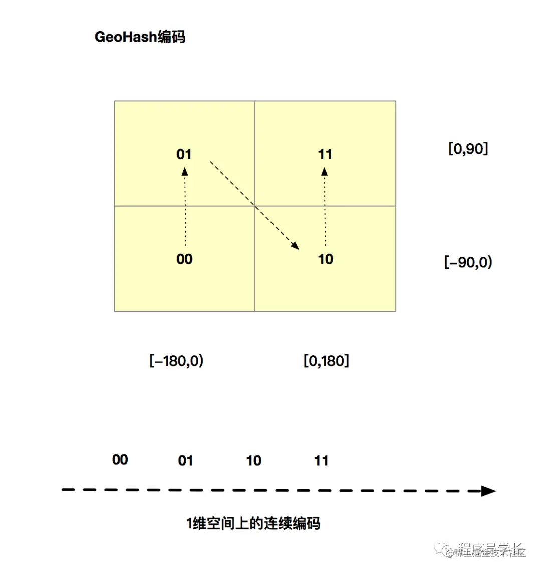 这4个分区对应了4个方格,每个方格覆盖了一定范围内的经纬度值,分区越多,每个方格能覆盖到的地理空间就越小,也就越精准。我们把所有方格的编码值映射到一维空间时,相邻方格的 GeoHash 编码值基本也是接近的,如下图所示: