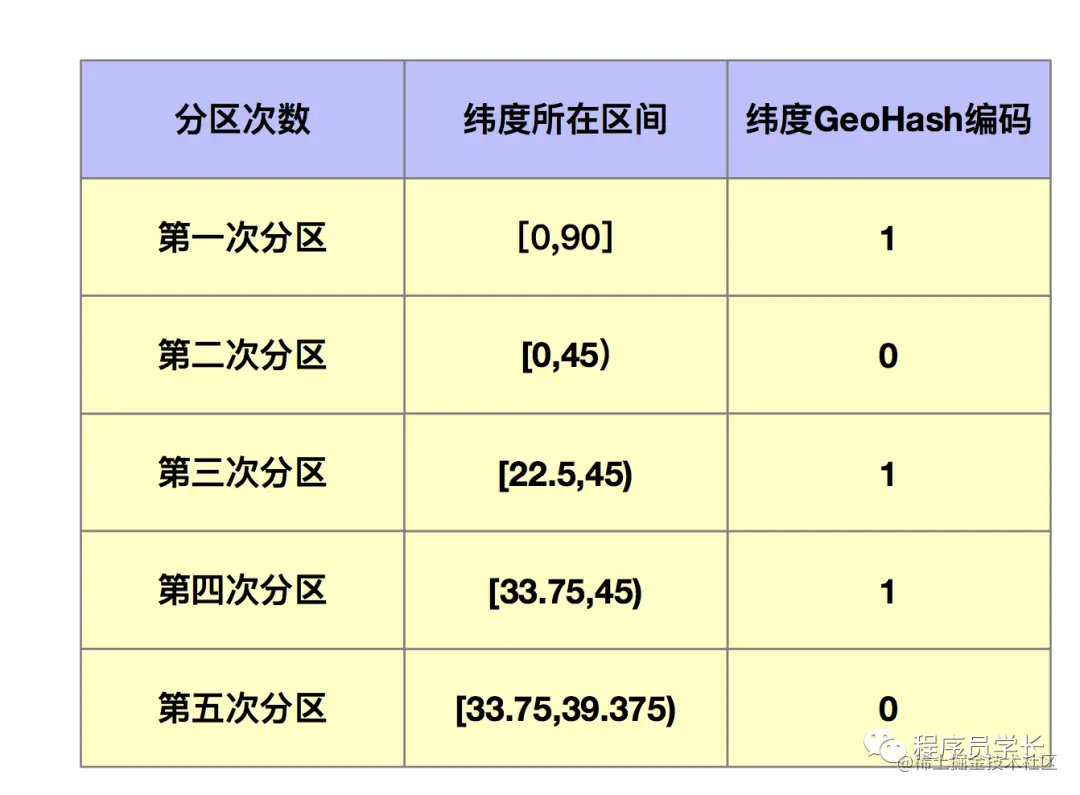 对于一个地理位置信息来说,它的经度范围是[-180,180]。GeoHash编码会把一个经度的值编码成N位的二进制数(把经度范围进行N次二分区操作)。我们进行第一次二分区时,经度范围[-180,180]会被分成2个子区间[-180,0)和[0,180]。然后看经度值落在哪个范围内,如果落在[-180,0),我们用0表示,如果落在(0,180],我们用1来表示。这样,每做一次二分区,就得到1位编码值。当做N次二分区,就可以得到N位编码值。
