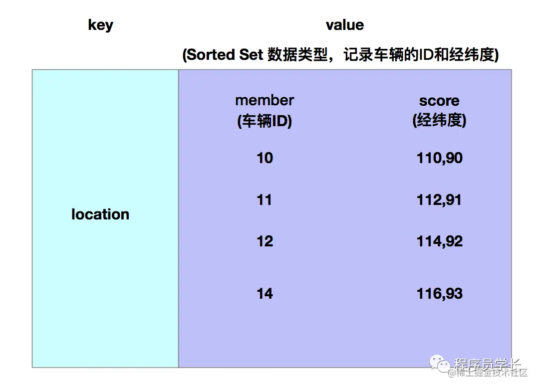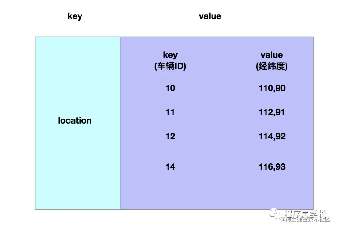 可以看到,一辆车(或者一个用户)对应着一组经纬度信息,并且随着车(或者用户)的移动,相应的经纬度也会发生变化。这种数据的特点是一个key(例如车的编号)对应着一个value(经纬度信息)。当有很多车辆的信息需要保存的时候,就需要有一个集合来保存一系列的key和value。在Redis中Hash集合类型可以快速访问一系列的key和value,正好可以用来记录一系列的车辆ID和对应的经纬度信息。所以,我们把不同车辆的ID和其对应的经纬度值存在Hash集合中。如下图所示: