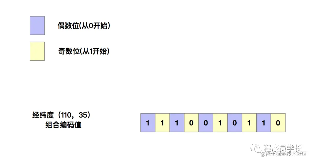 当一组经纬度的值都编码完成后,我们再把他们组合在一起。组合的规则是:最终编码值的偶数位上依次是经度的编码值,奇数位上依次是纬度的编码值。其中,偶数位从0开始,奇数位从1开始。