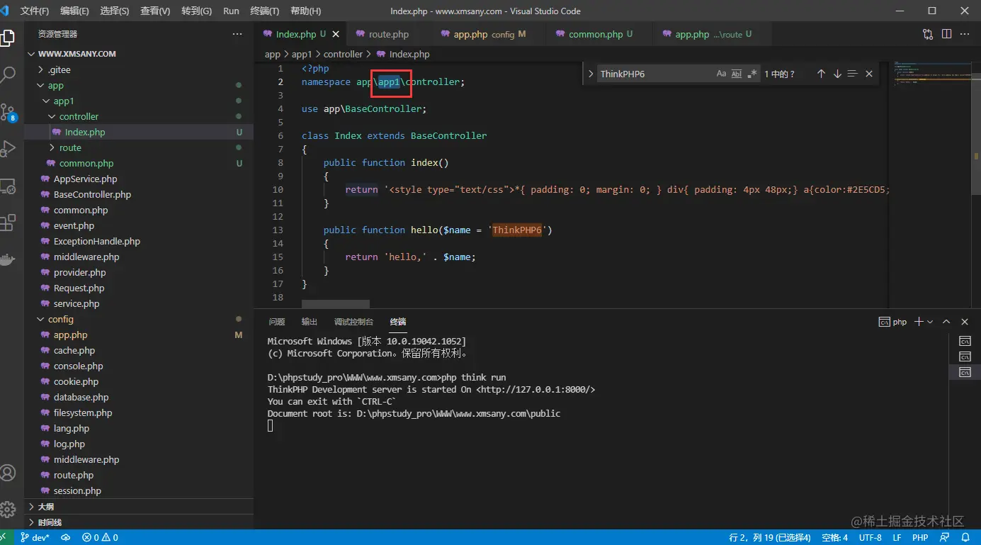 记得修改app2/controller/index.php中的namespace的app1为app2,然后修改下index方法中的文字,如图: