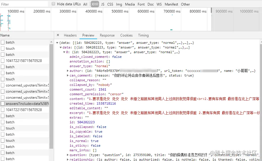 b. 点击请求之后,出现详情页,然后切换到 Preview 选项卡,可以预览该请求返回的内容。我们需要找的请求,返回的内容一般是 json 格式的数据,其中包含了关于知乎回答的一些信息。