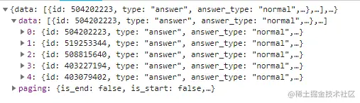 仔细观察可以发现,三者除了最后 offset 参数不一致外,其余构成完全一样,而且 offset 的值还很有规律,每次数字增加 5。然后联想到请求返回的 json 数据可知,每次请求返回 5 条数据。