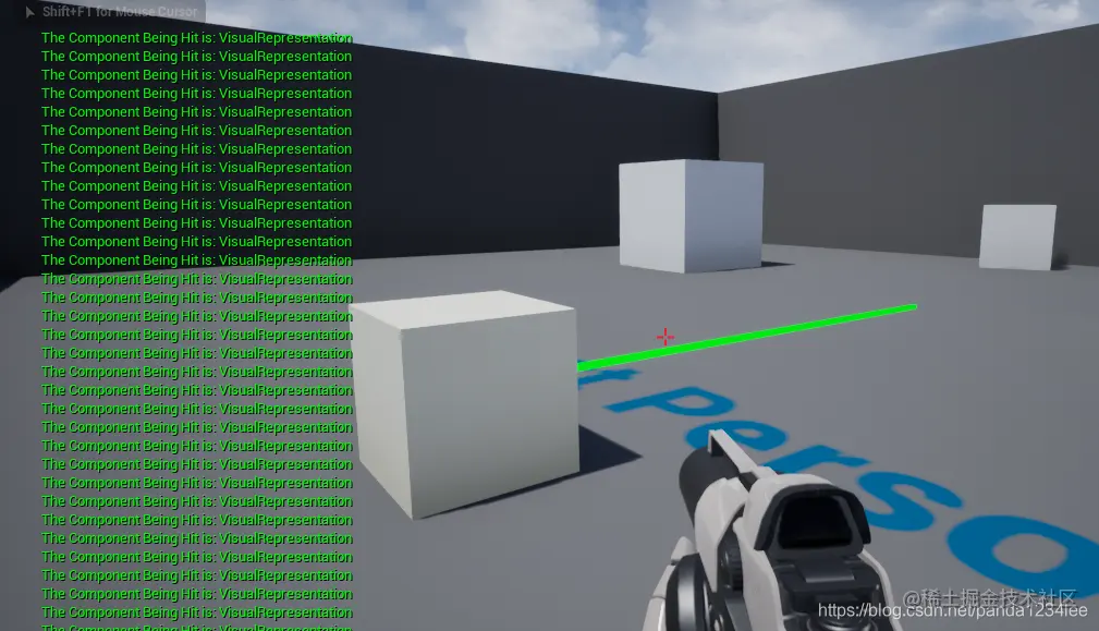 在开发时,我们希望看到我们的 射线追踪 。通过上面的变量,我们将使用 DrawDebugLine 函数来画一条绿色的线。如果 射线追踪 接触到我们这个 actor 中的任何组件,将向屏幕打印一条消息。