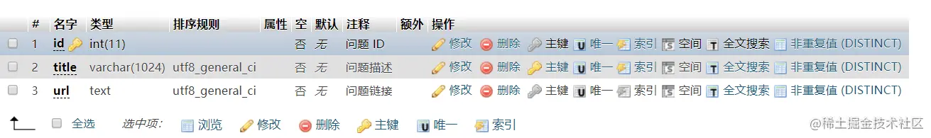 在 MySQL 数据库中创建数据库 zhuhuTopic 和数据表 questions,下面是我创建的表的结构。