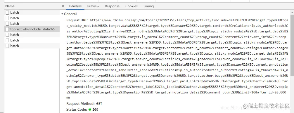 url = 'https://www.zhihu.com/api/v4/topics/' + topicID + '/feeds/top_activity?include=data%5B%3F%28target.type%3Dtopic_sticky_module%29%5D.target.data%5B%3F%28target.type%3Danswer%29%5D.target.content%2Crelationship.is_authorized%2Cis_author%2Cvoting%2Cis_thanked%2Cis_nothelp%3Bdata%5B%3F%28target.type%3Dtopic_sticky_module%29%5D.target.data%5B%3F%28target.type%3Danswer%29%5D.target.is_normal%2Ccomment_count%2Cvoteup_count%2Ccontent%2Crelevant_info%2Cexcerpt.author.badge%5B%3F%28type%3Dbest_answerer%29%5D.topics%3Bdata%5B%3F%28target.type%3Dtopic_sticky_module%29%5D.target.data%5B%3F%28target.type%3Darticle%29%5D.target.content%2Cvoteup_count%2Ccomment_count%2Cvoting%2Cauthor.badge%5B%3F%28type%3Dbest_answerer%29%5D.topics%3Bdata%5B%3F%28target.type%3Dtopic_sticky_module%29%5D.target.data%5B%3F%28target.type%3Dpeople%29%5D.target.answer_count%2Carticles_count%2Cgender%2Cfollower_count%2Cis_followed%2Cis_following%2Cbadge%5B%3F%28type%3Dbest_answerer%29%5D.topics%3Bdata%5B%3F%28target.type%3Danswer%29%5D.target.annotation_detail%2Ccontent%2Chermes_label%2Cis_labeled%2Crelationship.is_authorized%2Cis_author%2Cvoting%2Cis_thanked%2Cis_nothelp%2Canswer_type%3Bdata%5B%3F%28target.type%3Danswer%29%5D.target.author.badge%5B%3F%28type%3Dbest_answerer%29%5D.topics%3Bdata%5B%3F%28target.type%3Danswer%29%5D.target.paid_info%3Bdata%5B%3F%28target.type%3Darticle%29%5D.target.annotation_detail%2Ccontent%2Chermes_label%2Cis_labeled%2Cauthor.badge%5B%3F%28type%3Dbest_answerer%29%5D.topics%3Bdata%5B%3F%28target.type%3Dquestion%29%5D.target.annotation_detail%2Ccomment_count%3B&limit=10&after_id=0'