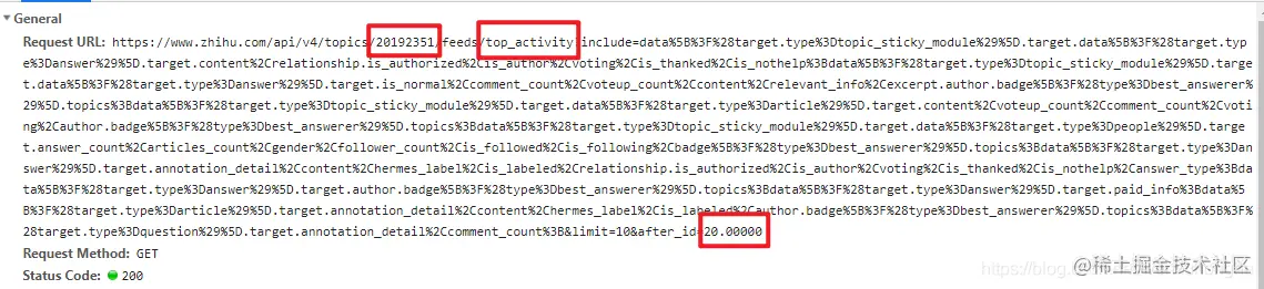 第一处(图中的 20192351 )是话题的 ID,如果后续大家想爬其他话题的话,只需要更改这个参数即可。