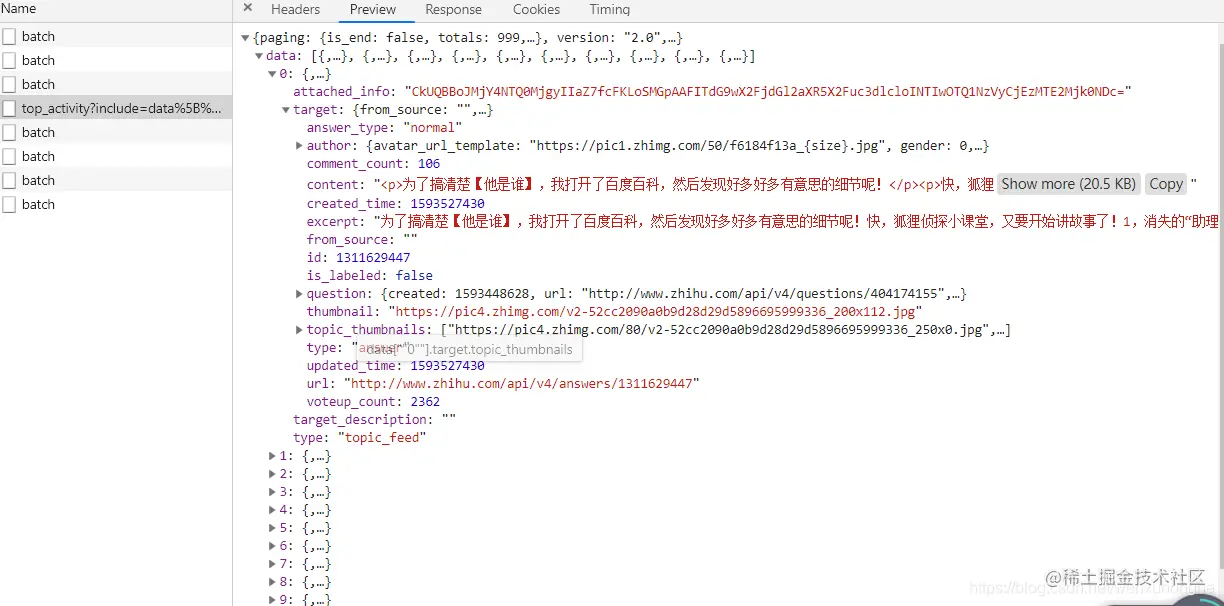第二处(图中的 top_activity )表示是 “讨论”页签的数据接口,同理,“精华”页签是 essence ,“等待回答”是 top_question。