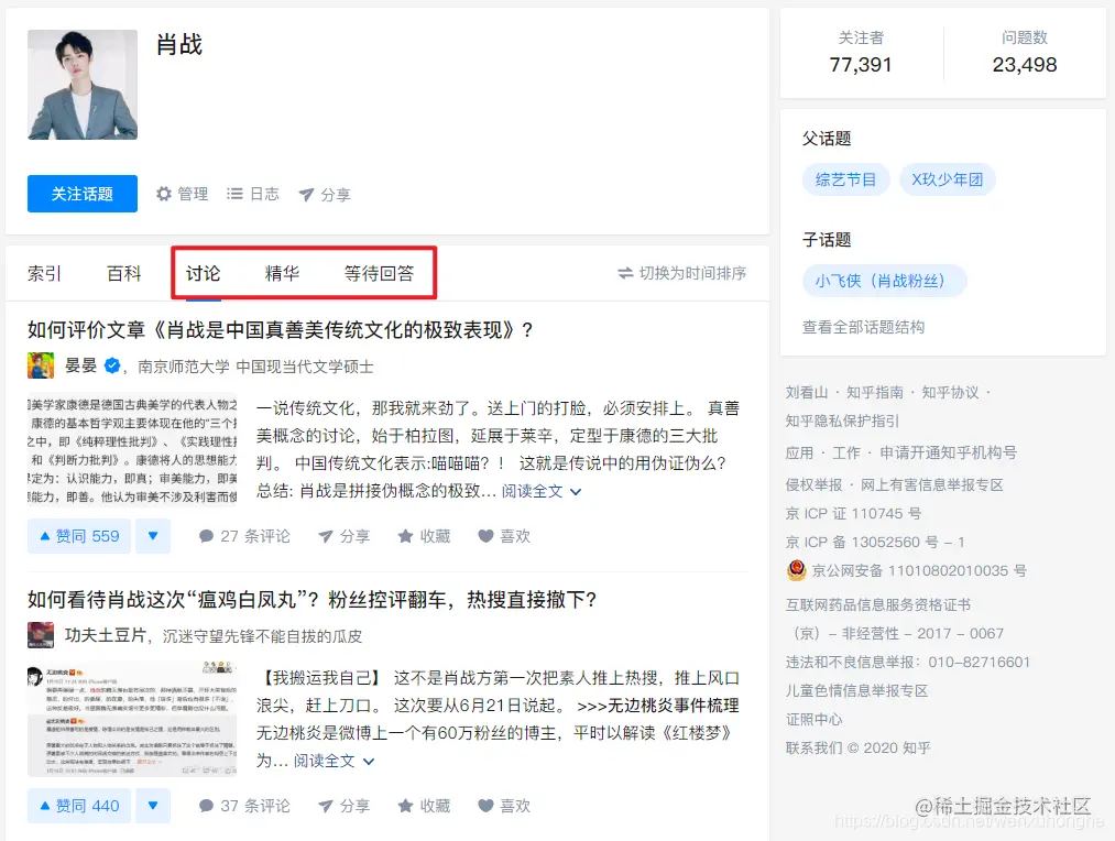 我们发现, 网站上并没有任何关于话题下所有问题的列表数据,所有的数据都藏在了 “讨论”,“精华”,“等待回答” 三个页签。