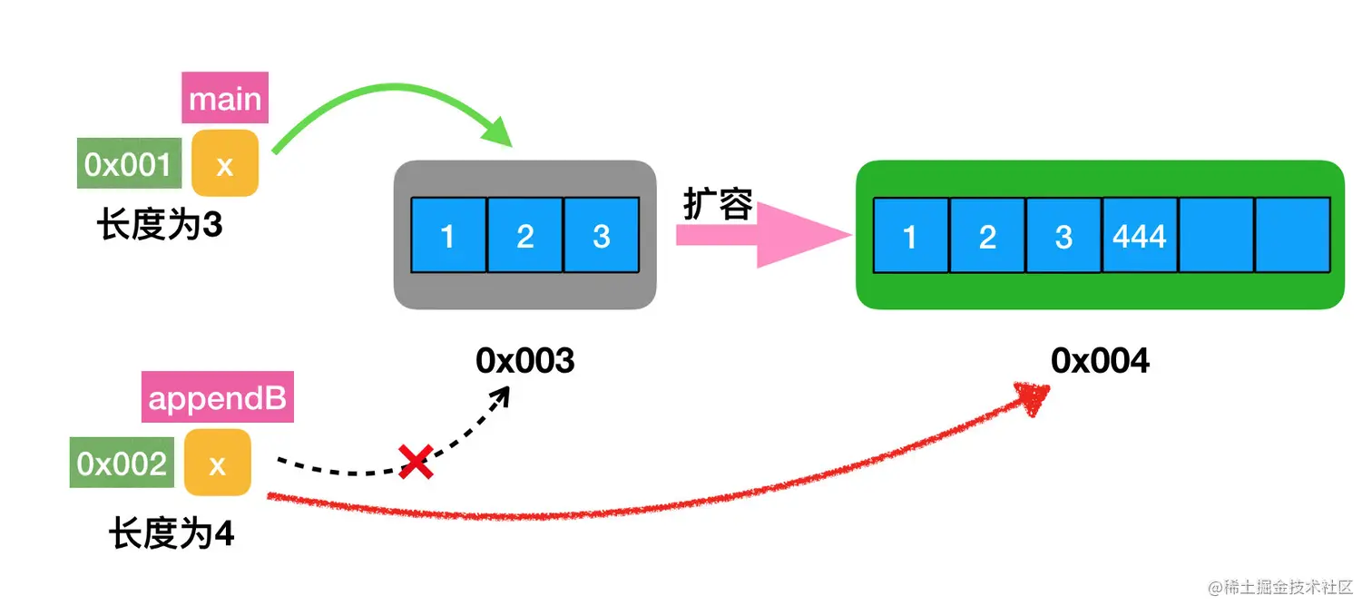 这是因为初始化 x 切片时长度和容量都为3,当在 appendB 函数中追加数据时,会发现没有位置了。