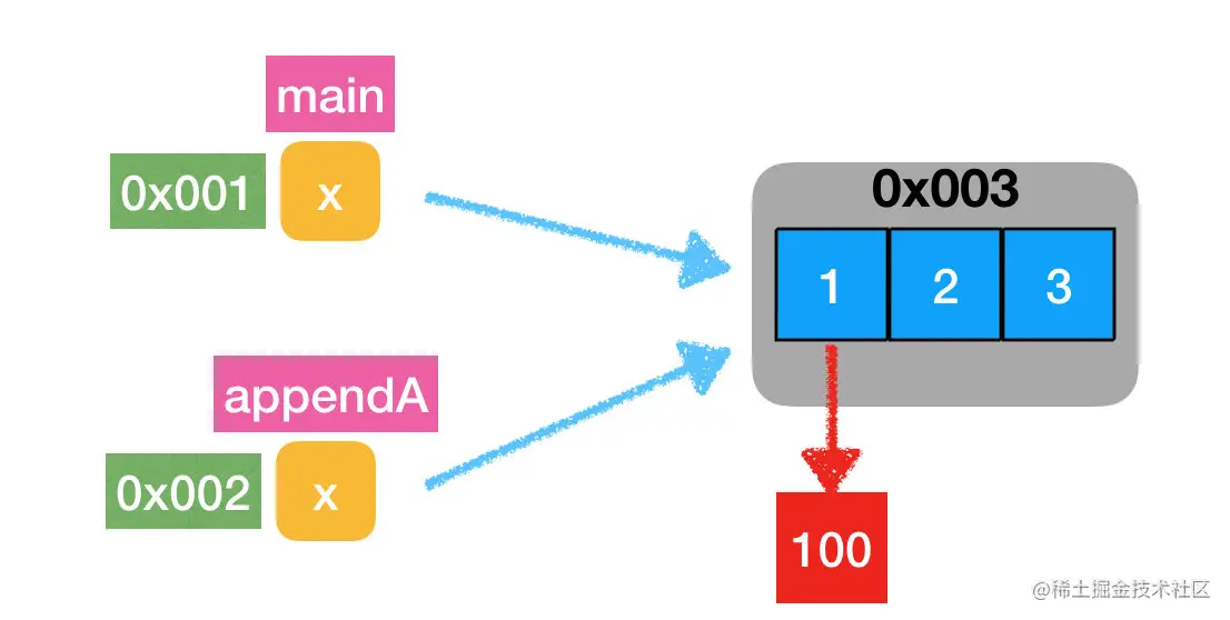 在函数传递过程中,main 中的 x 与 appendA 函数中的 x 切片所引用的是同个数组。