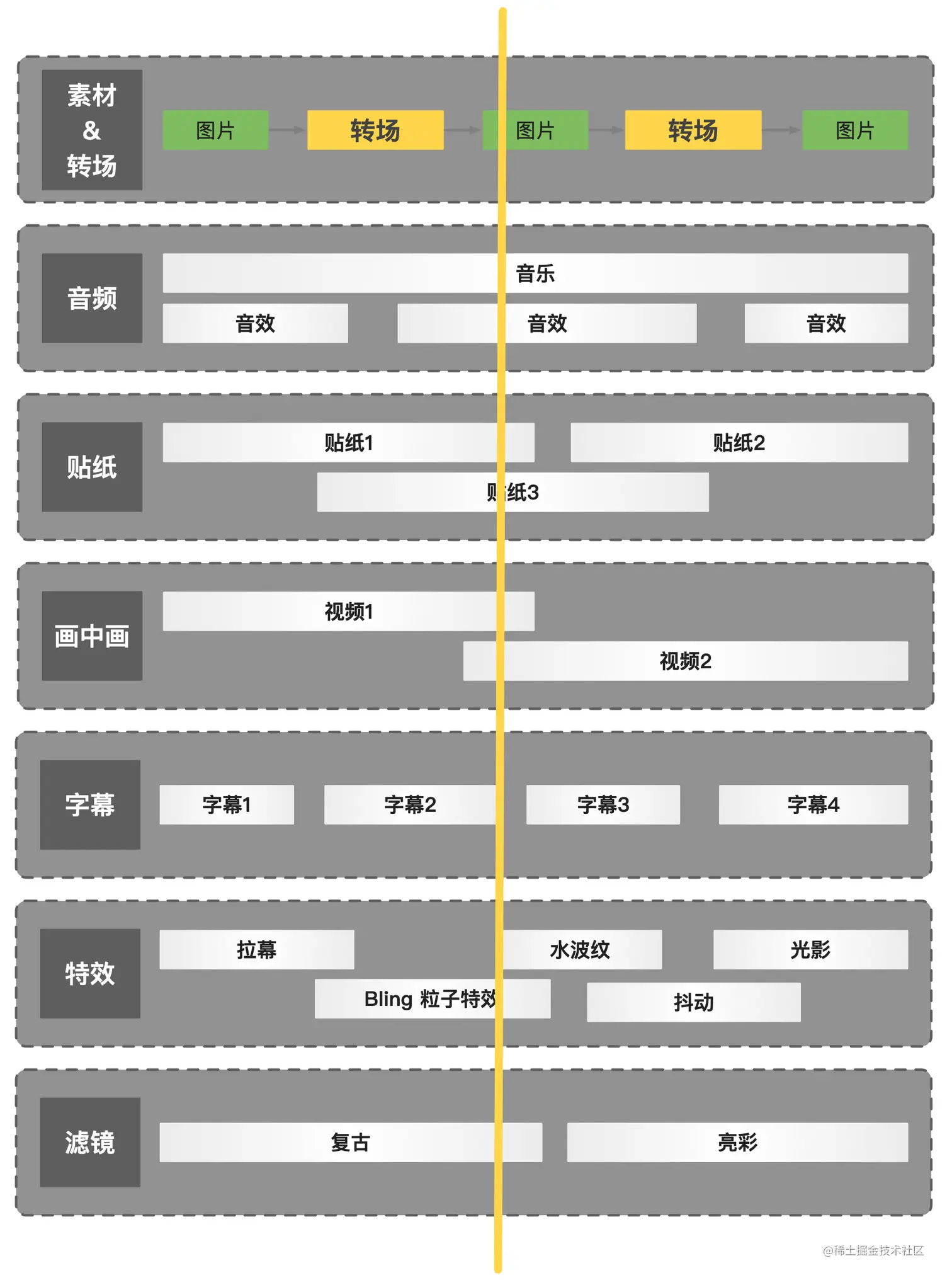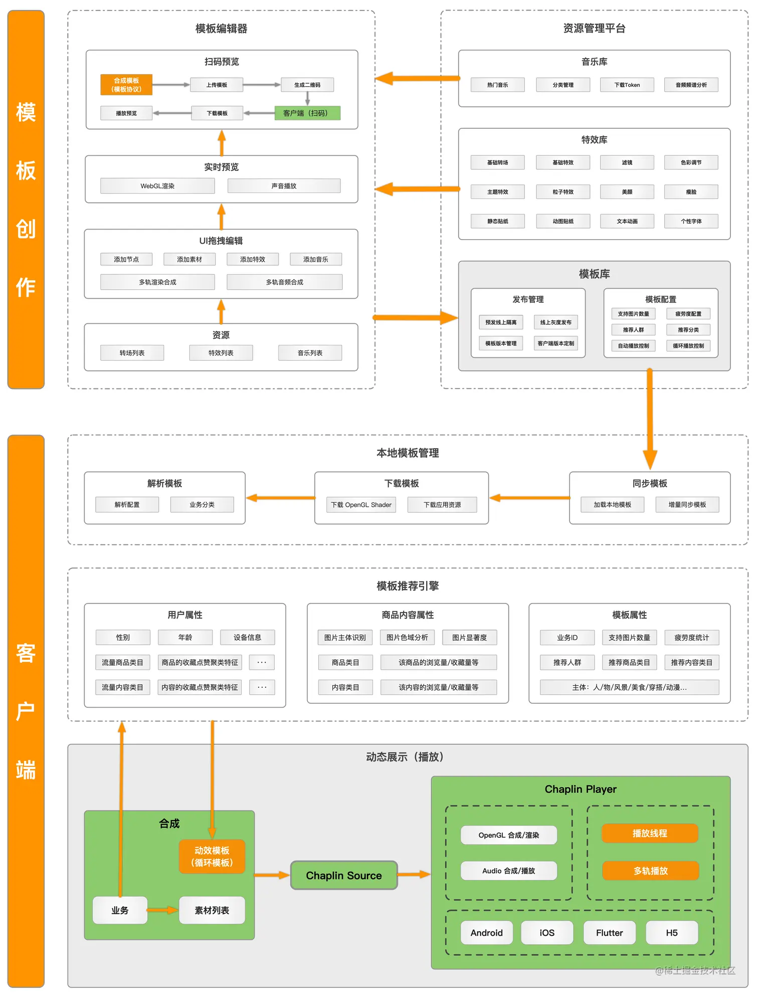 Chaplin项目,启发源于视频编辑器。在视频编辑阶段,可以通过各种特效使内容更丰富、生动。我们将素材与特效进行分离,最终将整个编辑过程抽象成模板。展示时,再将不同的素材与模板进行合并,实现视频播放的效果。