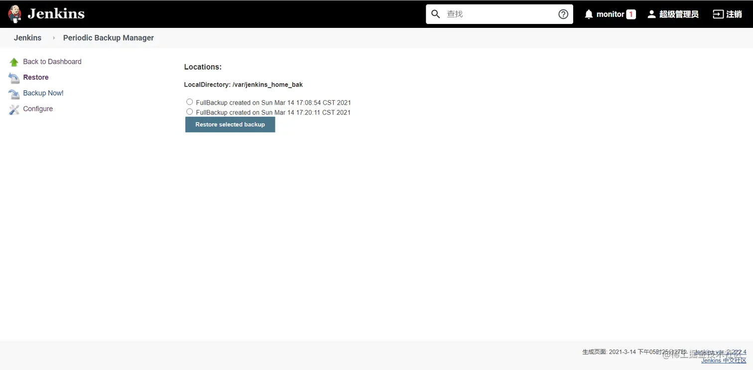 Periodic Backup 和 ThinBackup 插件的备份内容比较全面,其他的都只是备份 Jenkins 的配置文件。经过我的使用体验后发现 Periodic Backup 和 ThinBackup 插件的设置也是比较相似的。我这个就演示下 Periodic Backup 插件的使用。