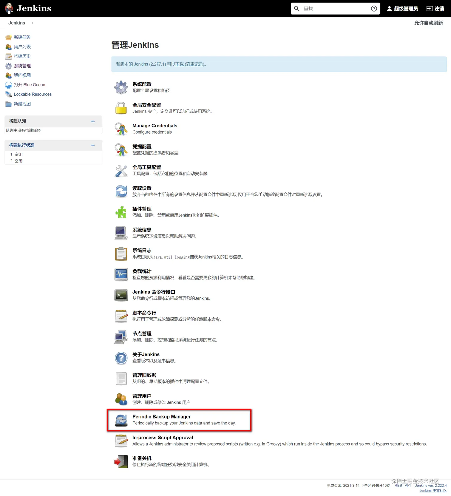 安装 Periodic Backup 插件后在 Jenkins 的【系统管理】中会多出一个【Periodic Backup Manager】选项。