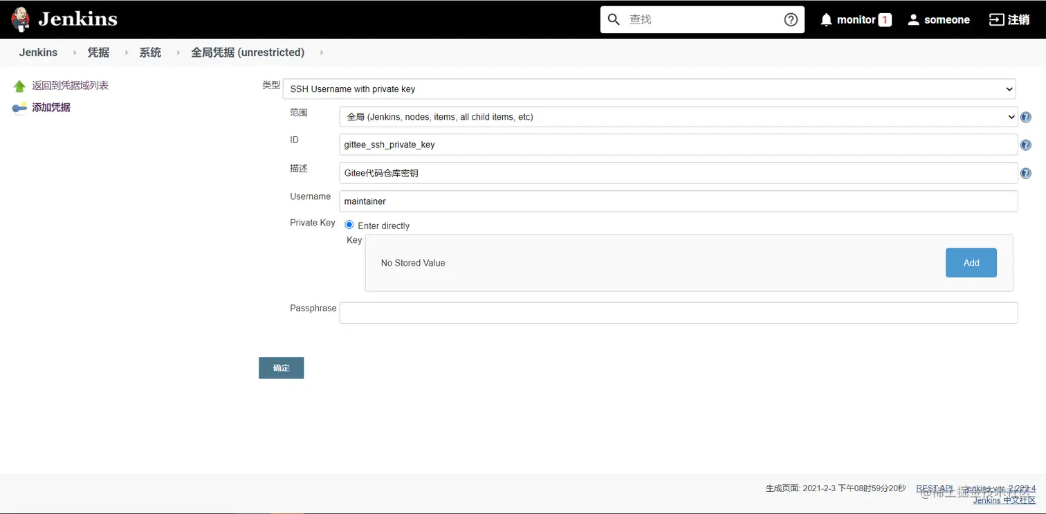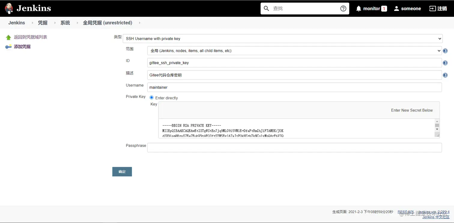 将 /home/maintainer/.ssh/maintainer 私钥文件中的内容配置到 Jenkins 的凭据中: