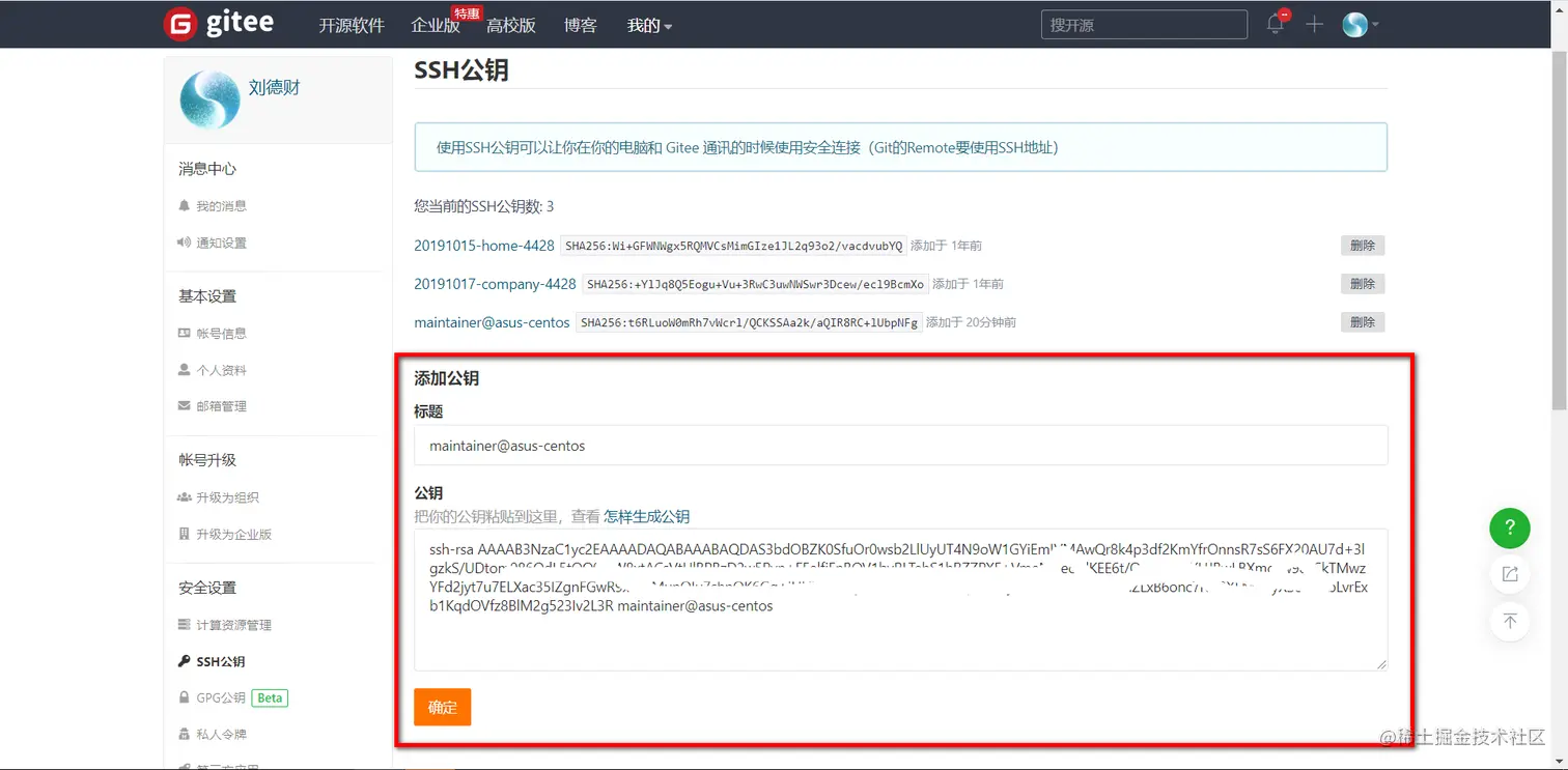 /home/maintainer/.ssh/maintainer.pub 公钥文件的内容添加到代码管理平台中:
