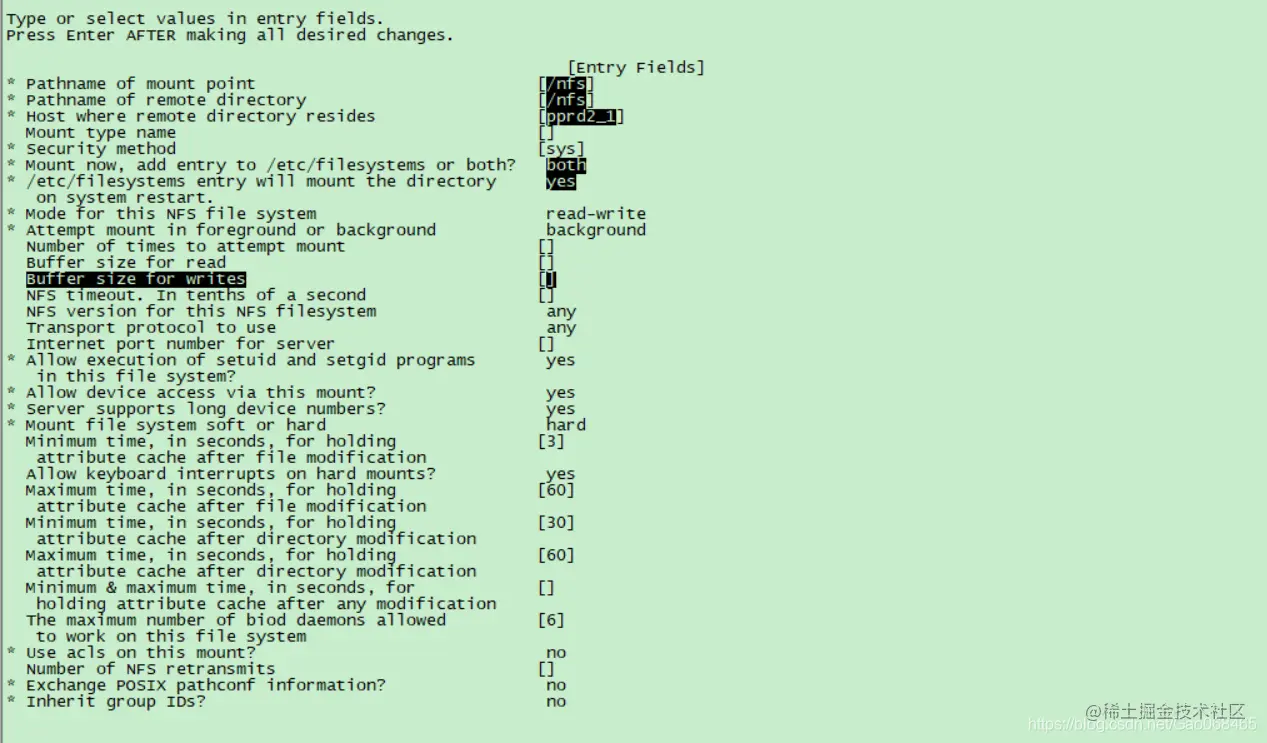 "MOUNT now,add entry to /etc/filesystems or both?"栏的默认值是 now,表示立即安装这个NFS,相当于直接安装,并不会修改/etc/filesystems 文件;如果选择 filesystems,表示只会修改/etc/filesystems 文件,并不立即安装;如果选择 both,则会修改/etc/filesystems文件,并且立即安装。