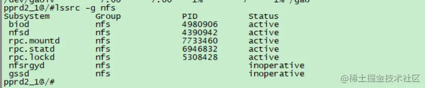 从上图可以看到作为NFS服务器的条件已经具备了,即相应进程已经启动。如果没有启动的话可以使用命令“mknfs -N”启动该服服务。如下图所示: