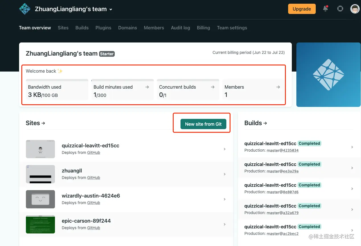 这时候,部署需要一些时间,得到下面的界面,你可以通过 Site settings 修改自己的网站名(这里不做演示,很简单)。