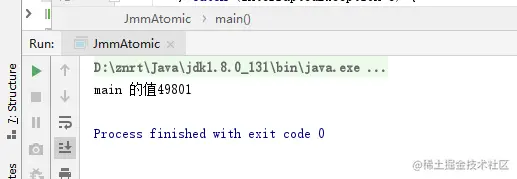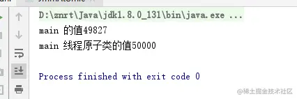 可以看到我们50个线程每个加1000个应该是50000个,最终的值却不足50000,我们是使用了volatile的,而volatile是不保证原子性的,所以值出现了差异,怎么解决这样的问题,想到的肯定是加锁synchronized、locks,这样肯定可以解决这个问题,但是我只为了一个数值的变化就加锁,锁可是很影响效率的,所以使用原子类,我们用的int所以使用原子类AtomicInteger找到里面等于i++的方法incrementAndGet,现在再执行看一下结果,代码: