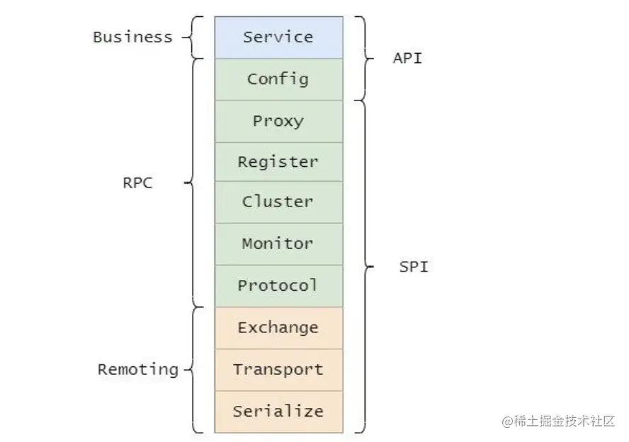 大的三层分别为 Business(业务层)、RPC 层、Remoting,并且还分为 API 层和 SPI 层。而分 API 层和 SPI 层这是 Dubbo 成功的一点,采用微内核设计+SPI扩展,使得有特殊需求的接入方可以自定义扩展,做定制的二次开发。
