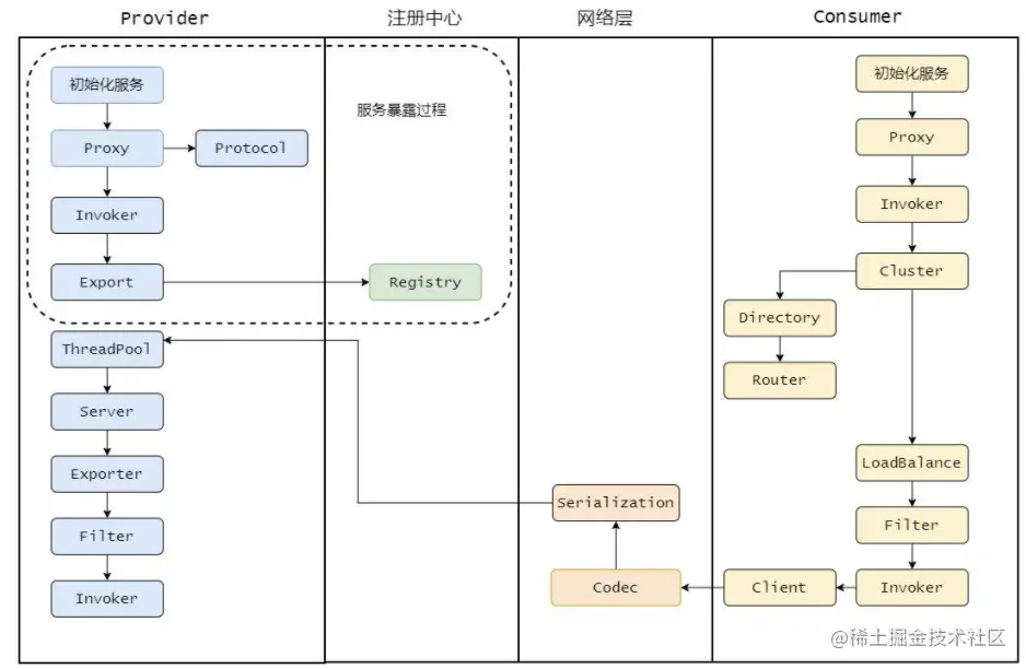 - 通过 Exporter 包装一下,将 Exporter 通过 Registry 注册到注册中心。