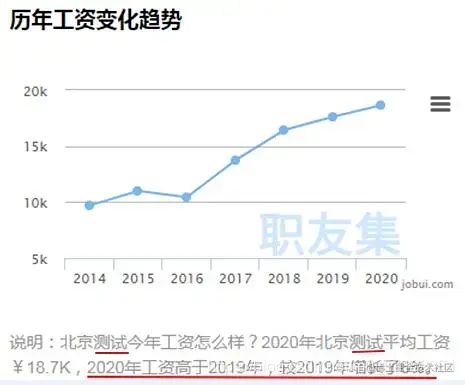 看完测试薪资是不是刷新了你的三观,原来测试薪资尽然可以做到这么高(可在职友集平台查看自己当地测试薪资)。但还要告诉你一个事实是:测试高薪只是开始,远没有结束,因为测试近几年来的薪资一直往上涨,哪怕是疫情下的2020年。